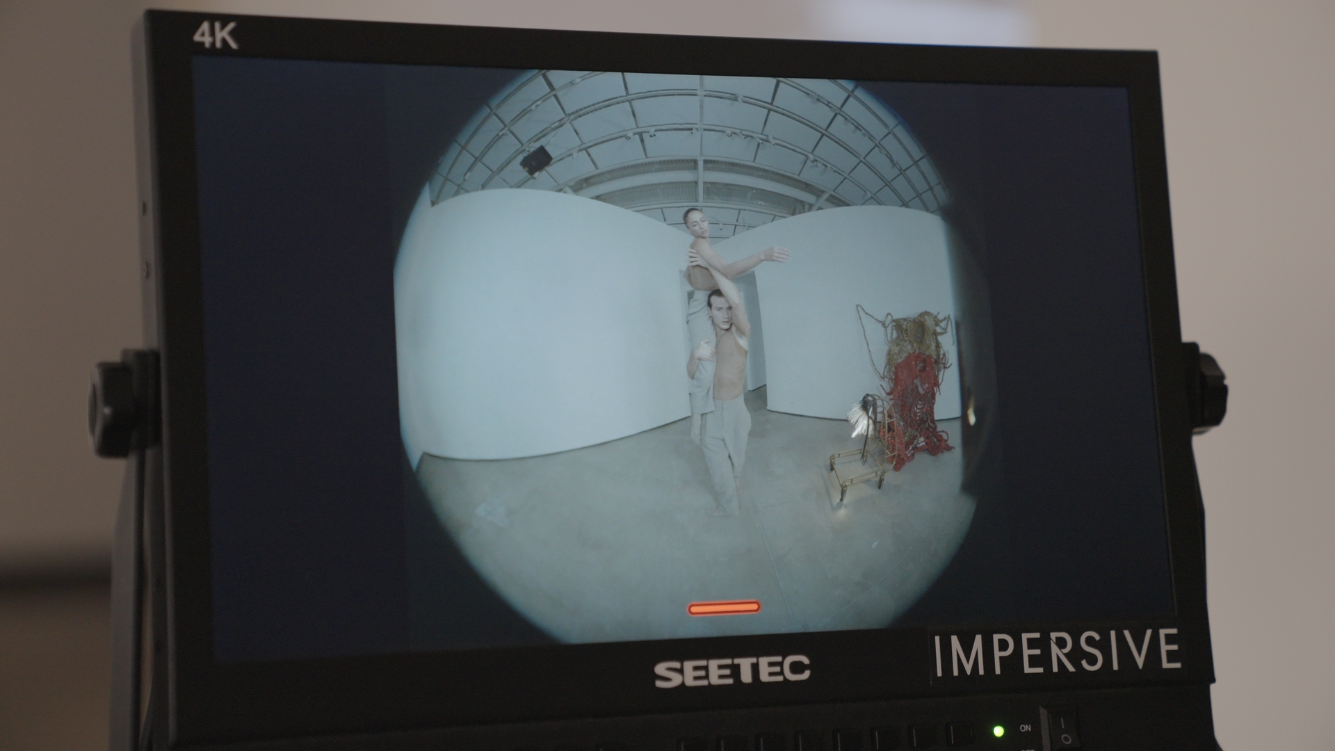 Nella versione VR, “AN ECHO, A FRAME” è un lavoro di danza immersiva in cui il gesto non rappresenta, ma reagisce. La realtà virtuale non congela il movimento: lo espone alla sua instabilità, rendendo visibile la tensione tra flusso e arresto, tra eco e fotogramma. Il punto di partenza è il mare, forse la visione che più di ogni altra ci avvicina all’idea di eternità, non per la sua infinità, ma per la sua continua trasformazione. Nel fluire dei danzatori riaffiora lo stesso moto naturale, ipnotico e instabile, che non conserva, ma ritorna. Il lavoro culmina nei costumi di Agglomerati, realizzati appositamente per le riprese: attraverso questi abiti il corpo smette di essere solo veicolo del movimento e diventa esso stesso opera, superficie sensibile e materia attraversata dal tempo. “AN ECHO, A FRAME” non racconta le grandi transizioni del nostro tempo – ecologiche, geopolitiche, demografiche, tecnologiche, culturali – ma le mette in vibrazione, come il mare, che non spiega, ma misura chi lo guarda.